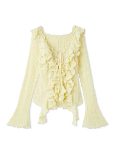 [A feminine ruffle-design knit pullover with frill and soft knit material][Design/Styling]This knit pullover features an adorable, airy pattern knit from fluffy boucle yarn, and eye-catching ruffle details for a romantic feel. The yarn is a soft, fluffy wool blend, making it lightweight and comfortable to wear. The neckline, cuffs, and hem are finished with a scalloped, wavy ruffle. The clean silhouette gently fits the body, while the wide neckline and generous flowing ruffles at the placket add a touch of elegance. The long bell sleeves add a trendy touch. The neckline features a tie detail that can be tied with a ribbon for a charming touch. It can also be worn off-the-shoulder. While the knit fabric is slightly sheer, it comes with a matching stretch strapless top for added security. Try pairing this piece with casual denim for a contrasting set-up.[Fabric]Available in three colors: ivory, heathered gray, and yellow.Transparency: Yes Lining: Inner includedElasticity: YesShine: NoFabric thickness: Slightly thick Color The color may appear different from the actual product due to lighting. Additionally, due to settings on the computer or smartphone, the color of the actual product may differ slightly from the image. Size and Chart Pullover Size Length Bust Neck Depth Waist Hem Width F 21.3 in 27.6 in 4.7 in 22.8 in 16.5 in Inner Size Length Bust F 12.2 in 28.1 in Details and Care Material: MAIN MATERIAL ACRYLIC 49% WOOL 32% NYLON 19% INNER POLYESTER 100% SKU: SWNT255136 Imported