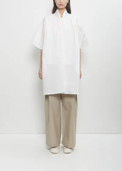 Sofie D'Hoore off white open front overshirt with deep side welt pockets in crisp and lightweight cotton. Features a stand collar and kimono sleeves. Relaxed fit. Comes unlined. Sizing: European (32-40). 32= XXS, 34=XS, 36=S, 38=M, 40=L. Gabrielle is 5’10.5” (179cm), bust 31", waist 23.5", hips 33.5" and wears a size 34. Color: Off White. 100% Cotton. Imported. SS25SD019