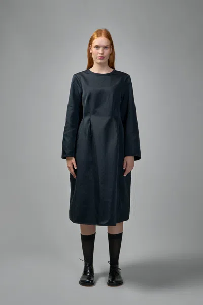 Midi dress in black with a minimalist A-line silhouette and long sleeves. It shows a crew neckline, a visible center-back seam and smooth, slightly lustrous fabric falling to a knee-to-midcalf length. <ul> <li>Crew-style neckline finish</li> <li>Visible center back seam</li> <li>Full-length long sleeves</li> <li>A-line midi-length silhouette</li> <li>Smooth slightly lustrous fabric</li> <li>Knee-to-midcalf hem length</li> <li>Clean straight hemline finish</li> </ul>