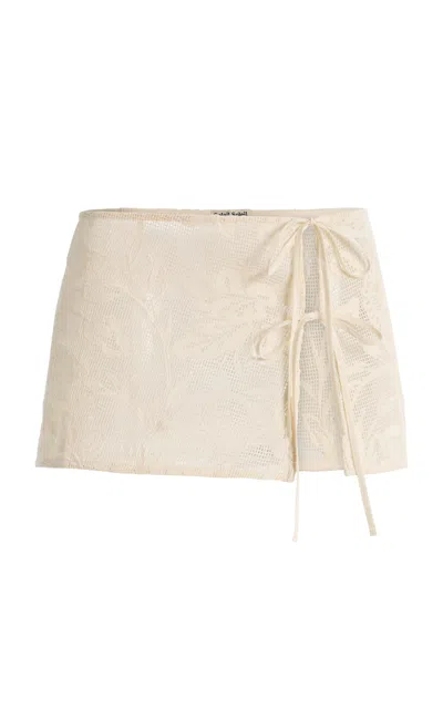 Soleil Soleil is designed for the sun chasers and slow; golden days by the water.The 'Annie' is an apron-style wrap made from custom embroidered lace with two tie closures. Designed for layering; it can be styled over swim as a mini skirt or worn over pareos and ready-to-wear.