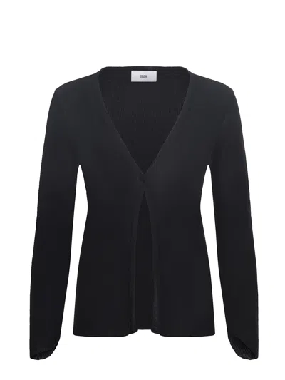 Solotre sweater made of black viscose. Semi-transparent. Wide V-neck. Long sleeves with draped cuffs. Closure with central button. 100% viscose Made in Italy