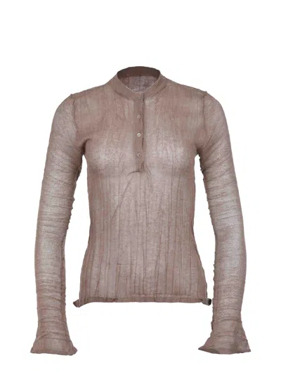 Solotre sweater made of a blend of viscose in Bronze color. Semi-transparent. Ribbed crew neck. Long sleeves with a wide hem. Pleated effect. Button closure at the chest. 75% viscose 25% polyamide Made in Italy.