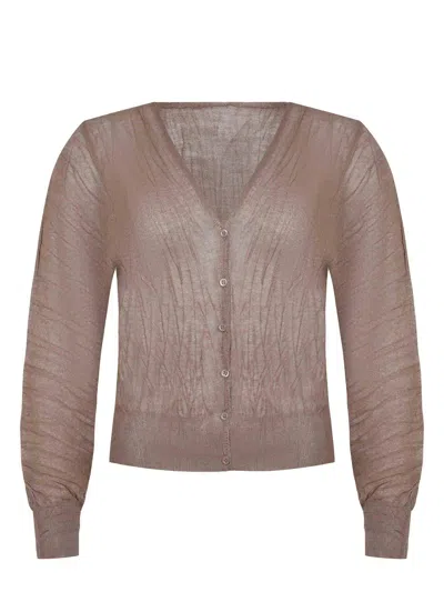 Solotre sweater made of a blend of viscose in Bronze color. Semi-transparent. V-neck. Long sleeves. Ribbed cuffs. Front closure with buttons. Pleated effect. 75% viscose 25% polyester. Made in Italy.