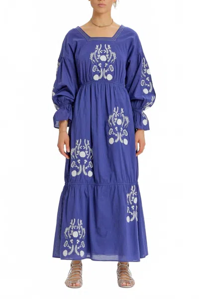 Embroidered Tiered Long Sleeve Maxi Dress In Navy Combo In Blue