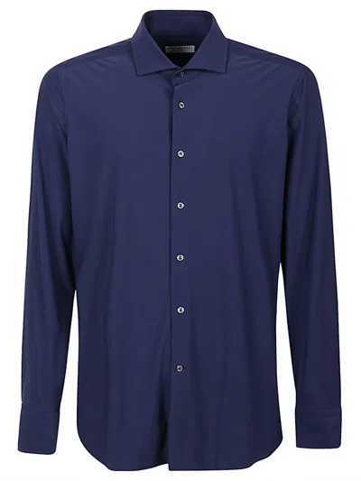 Blue shirt, buttons closure, high collar.