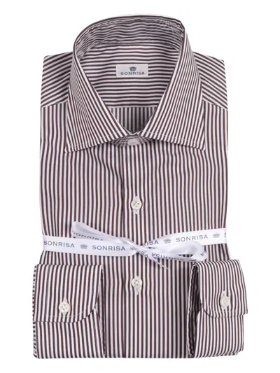 Timelessly elegant, this Sonrisa formal shirt showcases vertical stripes in dark brown and white, enhancing its classic appeal. Crafted from 100% premium cotton, it features a structured collar, buttoned cuffs, and a button-down front, ensuring a polished and refined appearance. Perfect for sophisticated occasions, this shirt represents the epitome of men's dresswear. 100% premium cotton Vertical stripes in dark brown and white Structured collar Buttoned cuffs Button-down front