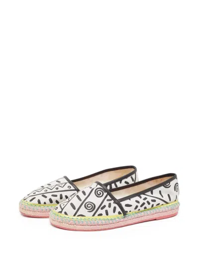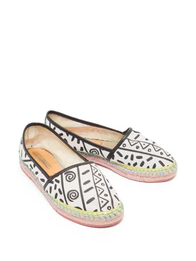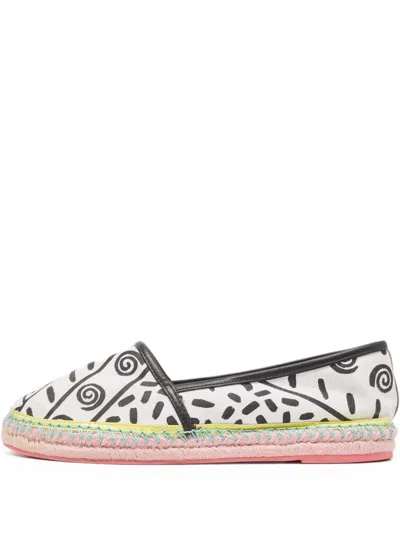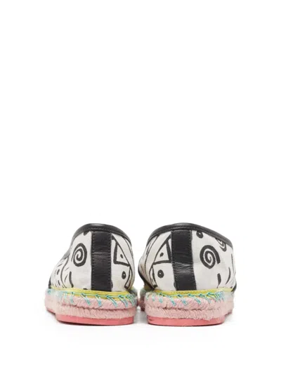 white abstract black print braided jute sole rubber outsole Condition: GOOD. This previously owned and used item is in good condition with minimal signs of use. This may include fading of material or plating and scratches.