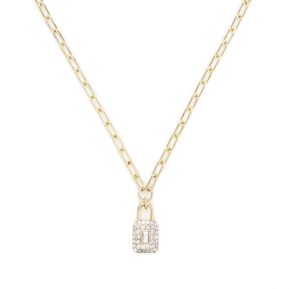 Sophie Ratner Diamond Squared Lock in Yellow Gold/White Diamonds: Ready to ship in 2-3 weeks. Fans of Sophie Ratner’s delicate diamond-studded pieces will be over the moon for this version..75 karats of diamonds shine across the fully-encrusted face of this 14K gold lock—and at the center sits a baguette-cut sparkler. Held on an 18 inch cable chain by a double-ring, this is a striking piece you’ll wear with everything.14k gold,.75ct white diamonds 18" chain Made in USA.