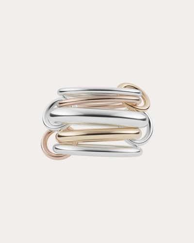 Inspired by its celestial constellation's natural occurrence of opulent light, the Leo ring features five solid bands in varying gauges and metal tones. Orbiting annulet connectors create a linked design that can be worn stacked on one finger or spread across multiple. 18k yellow gold, 18k rose gold and sterling silver Polish with soft cloth Handmade in Los Angeles, USA Measurements Band 1 (top) width: 1.7mm Band 2 width: 1.7mm Band 3 width: 3.8mm Band 4 width: 2.7mm Band 5 (bottom) width: 2.3mm Sustainability Metrics: Circular Economy: product is intentionally designed with 50% of actively cycled materials Conflict-Free: 100% of products are recycled or conflict-free and adhere to fair trade and labor Craft & Community: at least 75% of products are fully sourced and manufactured within the specified community or country; 100% of production adheres to a fair wage system Read more about Olivela's sustainability pillars here. Spinelli Kilcollin Women's Leo Tri-Tone Core Linked Ring in Gold