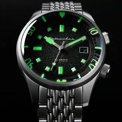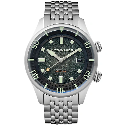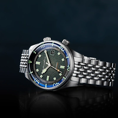 Spinnaker Bradner Automatic Emerald Green The Bradner timepiece is a vintage diver developed with a compressor case, bi-directional inner turning bezel, and liberal application of Swiss-superluminova material. The timepieces are fitted with beads of rice bracelets which complements its neo-vintage aesthetic perfectly. SPECIFICATIONS MOVEMENT Japan NH35 Automatic Movement with 3 Hands with Date CASE Material: Stainless Steel Diameter: 42mm Thickness: 15mm Lug to Lug: 50mm Shape: Round Color: Stainless Steel Glass: Sapphire Lens DIAL Color: Green BAND Type: Solid Bracelet Color: Stainless Steel Buckle: Fold Over Buckle with Safety Lock & Push Button Width: 20mm WATER RATING Water Resistance: 18 ATM OTHER DETAILS Watch Weight (g): 95 Warranty: 2 Years International Spinnaker Bradner Automatic Emerald Green The Bradner timepiece is a vintage diver developed with a compressor case, bi-directional inner turning bezel, and liberal application of Swiss-superluminova material. The timepieces are fitted with beads of r