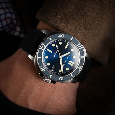 Spinnaker Hull Automatic Arctic Blue The Hull diver is robust but still elegant as a timepiece. Designed with a nod to vintage design cues and created by a manufacture that is deliberate, dedicated, and detailed in every way. With Swiss Super Luminova applied on the dial indexes and hands, it is a classic diver style dial designed for visibility and legibility. A small nod to some of the vintage flair can be found in the railway style seconds tracks running around the hour and minute markers, making a pronounced diver dial that is bold yet refined and perfectly at home at the depths of the sea or on dry land. SPECIFICATIONS MOVEMENT Japan Automatic 3 Hands with Date CASE Material: Stainless Steel Diameter: 42mm Thickness: 14mm Lug to Lug: 50mm Shape: Round Color: Stainless Steel Glass: Sapphire Crystal Lens DIAL Color: Dark Blue BAND Type: Genuine Leather Strap Width: 22mm WATER RATING Water Resistance: 30 ATM OTHER DETAILS Watch Weight (g): 110 Warranty: 2 Years Internation Spinnaker Hull Automatic Arctic Bl