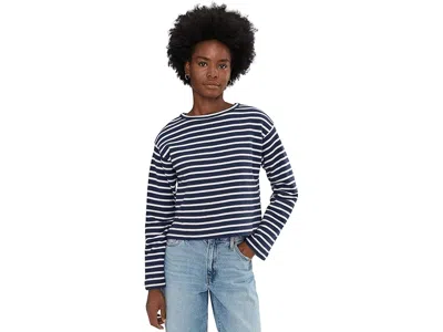Splendid Livie Stripe Pullover - Women's Sweatshirt : Navy/Moonstone : Wrap yourself in the soft poetry of stripes. The Livie Stripe Pullover drapes like a quiet sunrise along your shoulders – soft cotton threads weaving a story of comfort, ease, and subtle sophistication. Each band of color whispers of windswept walks, cozy cafés and the gentle silver dusk of early evening. The crew neckline frames the face like a gentle exhale. The relaxed silhouette, perfectly poised between casual and elegant, invites you to move freely – whether tucked into high-rise trousers or paired with your favorite denim. The stripes themselves don't shout; they murmur. They tell of effortless style, refined touches, and an enduring sense of ease. ; Pull-on style. ; 82% polyester, 18% nylon. ; Dry clean only. ; Imported. | Splendid Livie Stripe Pullover Women's Sweatshirt Navy/Moonstone : MD (Women's 6-8), Nylon/Polyester