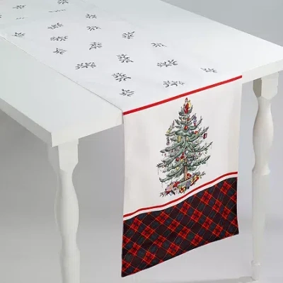 The Spode Christmas tree� tartan 14" x 72" table runner is a new twist on an old classic. The iconic Spode Christmas tree that's been around since 1938 is still the main attraction here, but it is now paired with a green and red tartan plaid that gives it a fresh, new look. With the Christmas trees on either end and finished with the tartan plaid border and holly and berries filling the top, this is sure to become a new favorite. Off-white, 100% polyester. Imported. Included: 1 Table Runner(s)Shape: RectangleUse: IndoorMeasurements: 108 Length/Inches, 14 Width/InchesBase Material: 100% PolyesterFabric Description: WovenCare: Tumble Dry, Machine WashDecor Styles: TraditionalCountry of Origin: Imported