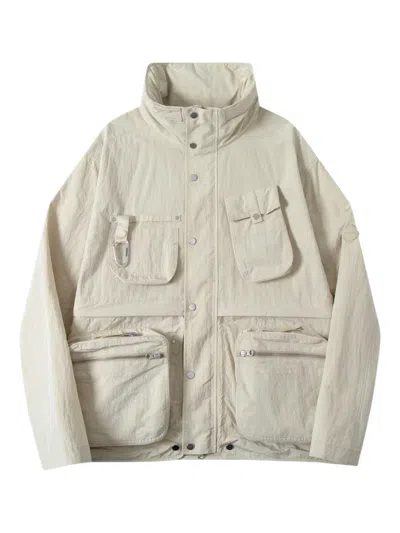 light beige high neck silver-tone hardware snap-button fastening multiple pockets long sleeves