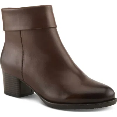 A foldover collar adds a touch of refinement and subtle dimension to a burnished leather bootie grounded by a cushioned footbed and a durable, stacked heel. 2" heel 6 1/4" shaft Side zip closure Cushioned footed Leather upper/synthetic lining and sole Imported