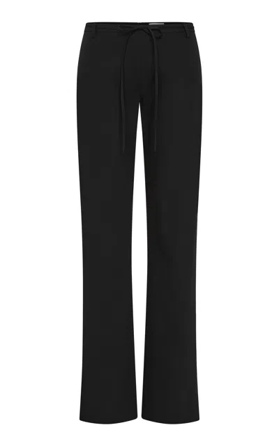 Low rise; straight leg; fine waistband; center-back zip closure; belt loops; rouleau belt detail; back darts; back welt pockets; unlined