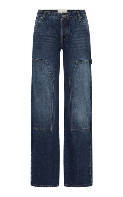Non-stretch denim; straight leg; low rise; fly-front zip closure; belt loops; knee panels; hammer loop; front slash pockets; branded patch on back; back patch pockets; unlined