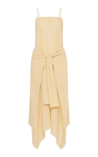 Square neckline; maxi length; sleeveless; thin rouleau straps; tie front detail; low scooped back; curved hem; unlined