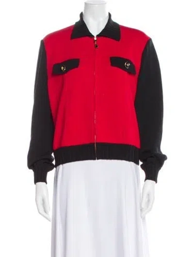 St. John Collection Cardigan Red Colorblock Pattern Long Sleeve with Collar Concealed Zip Closure at Front Fit: Knitwear by St. John Collection typically fit true to size. | St. John Collection Colorblock Pattern Sweater in Red, Women's S