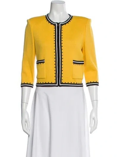 St. John Collection Evening Jacket Blue & Yellow Grosgrain & Studded Accents Collarless Patch Pockets & Zip Closure Fit: Jackets by St. John typically fit true to size. | St. John Collection Evening Jacket in Blue/Yellow, Women's US 4 | S