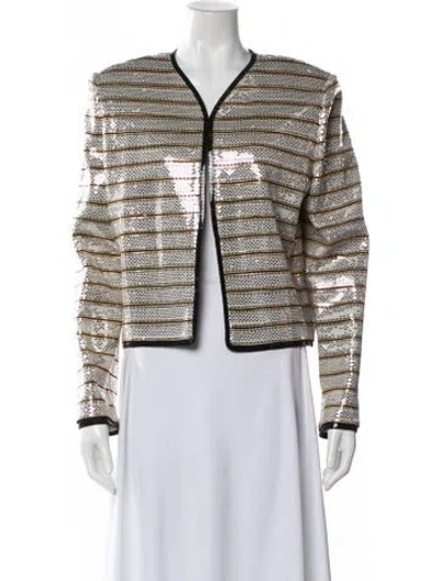 St. John Evening Evening Jacket Blue Printed Sequin Embellishments & Collarless Open Front Fit: Jackets by St. John typically fit true to size. | St. John Evening Printed Evening Jacket in Blue, Women's US 12 | XL