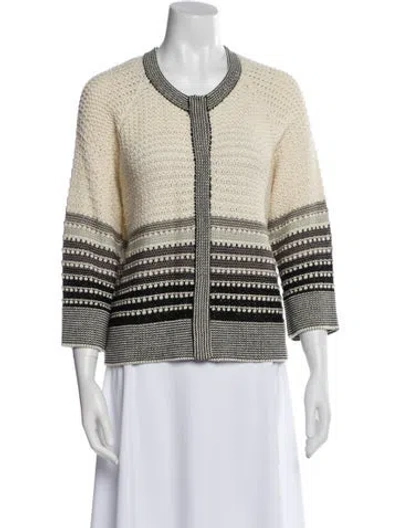 St. John Wool Evening Jacket Black & Neutrals Printed Crochet Trim & Collarless Snap Closure Designer Fit: Jackets by St. John typically fit true to size. | St. John Wool Printed Evening Jacket in Black/Neutrals, Women's L