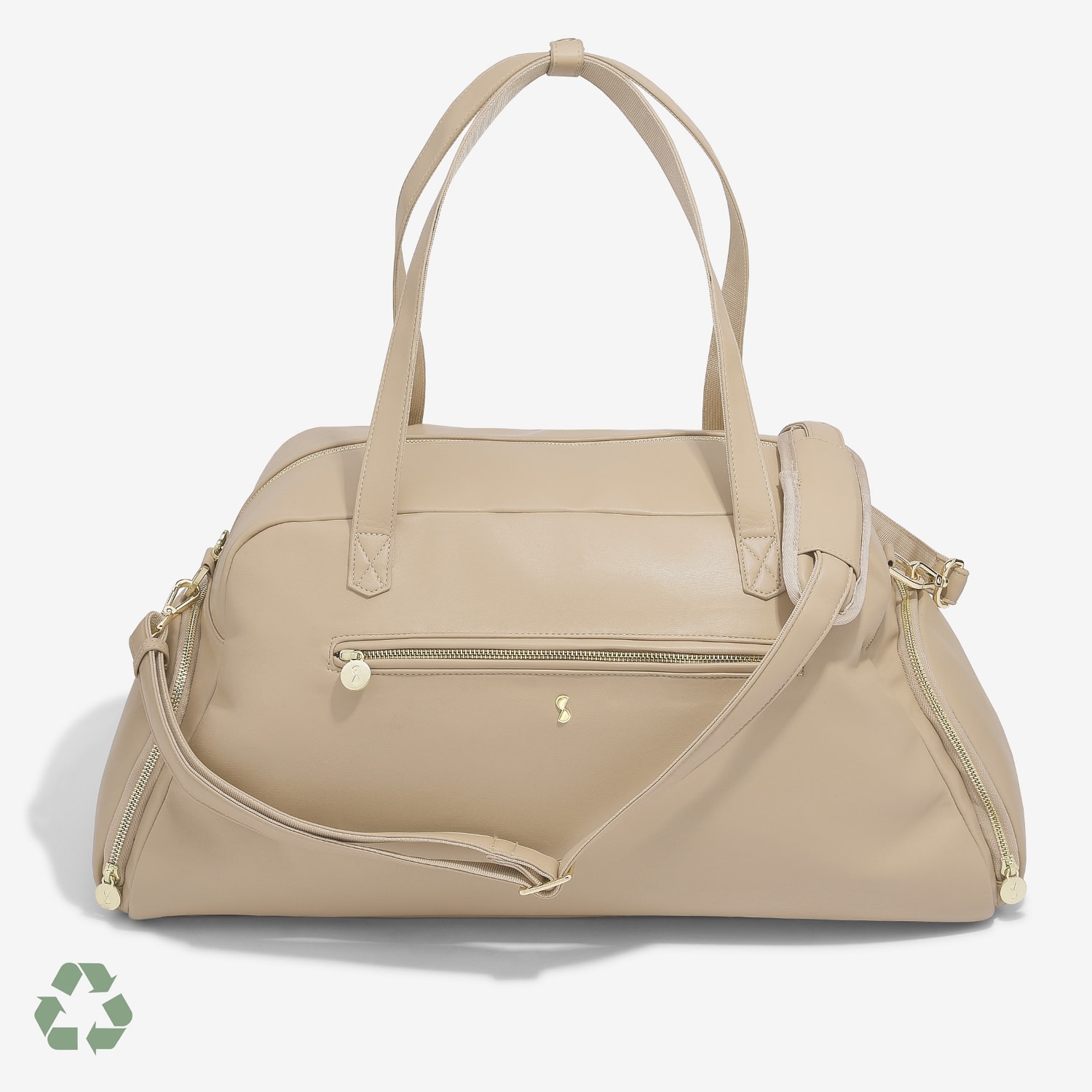 The Stackers Gym Bag is the perfect work-to-gym holdall, it'll carry everything you need for a full workout. The two handles make it easy to grab-and-go! While the long adjustable shoulder strap allows you to comfortably wear on your shoulder. Inside, you have a removable pouch for shoes or wet items, a designated elasticated bottle holder and elasticated pockets to store toiletries etc. As well as plenty of space for a towel and clothing. The external pockets include a built-in cable tidy (elastic loops) for your charger and earphones. The front zipped pocket has elasticated loops that can be used to hold a rolled-up yoga mat. In addition, included is a small pouch to store your jewellery, handy cosmetic mirror in a pouch and a removable zipped purse. Material: Faux Leather & Nylon Wipe clean with damp cloth
