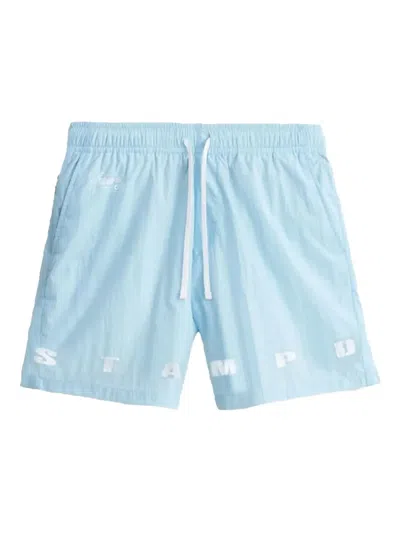 light blue elasticated drawstring waistband logo print embellishment two side inset pockets rear flap pocket