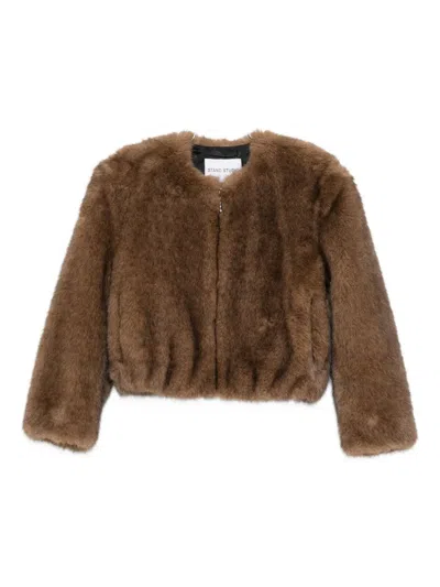 brown faux-fur zip fastening round neck long sleeves elasticated hem straight hem