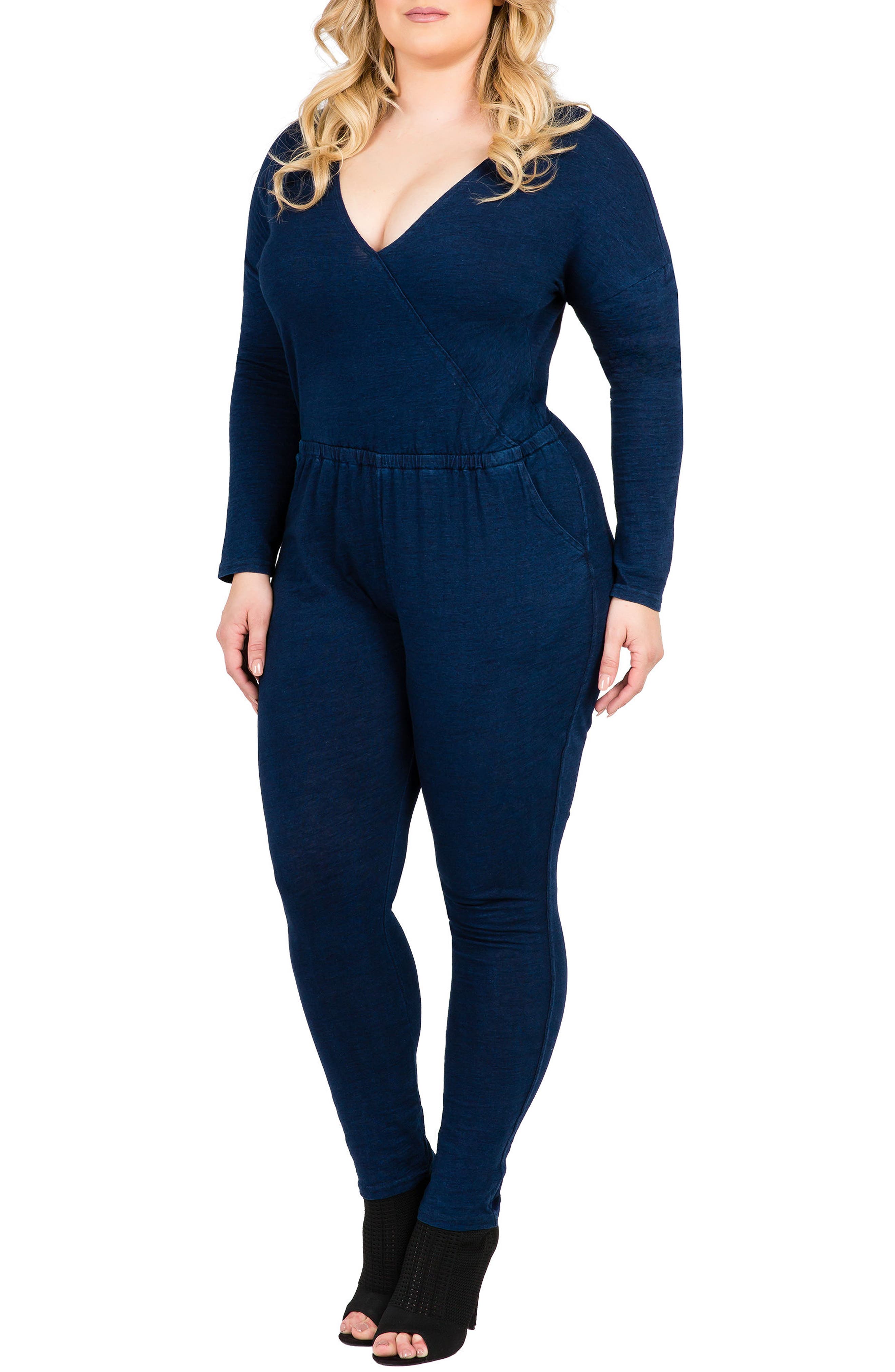 Pairing a drop-shoulder surplice bodice with skinny, tapered legs, this denim-knit jumpsuit offers a chic and more shapely take on the classic workwear style. Exposed back zip closure Surplice V-neck Long sleeves Elastic at waist Front scoop pockets Dark dyes may transfer to lighter materials 100% cotton Machine wash, tumble dry Imported Encore