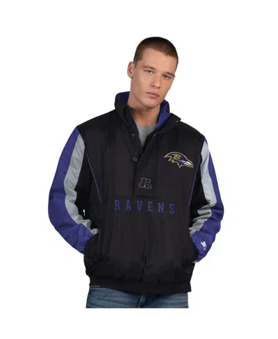 Showcase your Baltimore Ravens pride with this Men's from Starter. The quilted lining provides warmth and comfort, while the front zipper with four-snap overlay helps to provide protection from the elements. The fabric applique team logo with embroidered detail on the front and back proudly showcases your Baltimore Ravens pride, while the sleeve stripes and contrast-color piping add a touch of athletic flair. 1/2-Zip Brand: Starter Contrast-color piping Elastic cuffs and waist hem Embroidered team name on front Fabric applique team logo with embroidered detail on front and back Front pockets for warming hands or holding small items Front zipper with four-snap overlay helps to provide protection from the elements Imported Interior locker loop Left side bottom zipper for easy on/off Long sleeve Machine wash, tumble dry low Material: 100% Nylon - Shell A; 100% Polyester - Shell B, Filling and Lining Midweight jacket suitable for moderate temperatures Mock neck Officially licensed Printed conference logo with reflective detail Quilted Lining Sleeve stripes, one in team color, two with reflective properties