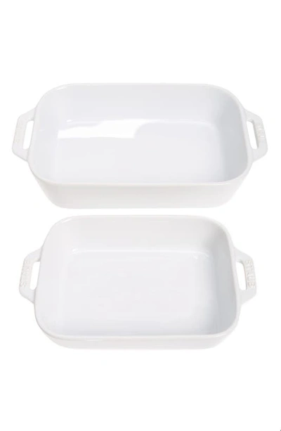 Perfect for everyday baking and roasting, this pair of lovely rectangular dishes is crafted from creamy, pristine white ceramic—making them both stylish and easy to clean.- Color: white- 2-piece set- Oven safe up to 572°F- ImportedSet includes:- Small Rectangular Baking Dish: 7 1/2" L x 6" W- Large Rectangular Baking Dish: 10 1/2" L x 7 1/2" WOrders cannot be shipped to Australia, Canada, Alaska, Hawaii, Puerto Rico or P.O. Boxes.