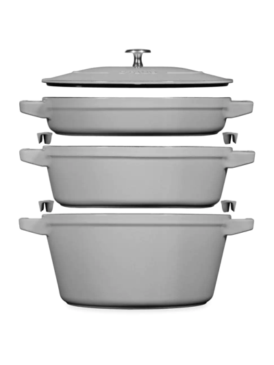 Staub stackable is the ultimate spacing-saving set featuring the essential cookware pieces for all the ways you like to cook. Thoughtfully designed with sloped sides to accommodate nesting, Staub stackable fits neatly into any storage area, including shelves, cupboards, and pot drawers. The set features a 5.25-quart round cocotte, 3.5-quart braiser, 10 grill pan, and a universal lid that can be used on each piece. Cook soup on the weekend in the cocotte, braise chicken thighs midweek in the braiser, and grill burgers on the grill pan for a quick family meal. The set price boasts a 30% savings over buying each piece individually. Attachable rubberized bumpers are included to ensure each piece remains scratch-free when stacked and unstacked. Like all Staub cast iron, the stackable set is unsurpassed for slow-cooking meats and vegetables to tender perfection, and for simmering hearty stews and soupscast iron possesses exceptional heat-retaining qualities, so the pot heats evenly throughout. With a heavy weight, tight-fitting lid that retains moisture and tiny spikes on the lid interior that create a rain-forest effect evenly returning juices back onto food, you can expect moist, perfectly cooked food every time you use these pans. Rooted in French culinary heritage, Staub cookware is beloved by professional and home chefs for its exquisite craftsmanship, exceptional performance, and timeless beauty.