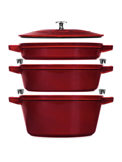 About The Brand: Cast Iron & Ceramic Cookware, Crafted In France For Chefs Everywhere. Color/Finish: Grenadine Staub Stackable Design Is Innovative, Unique And Fits Neatly Into Any Storage Area, Including Shelves, Cupboards, And Pot Drawers. 4-In-1 - Set Includes Cast Iron Dutch Oven 5.25-Quart Serves 4-6, Cast Iron Pan 3.5 Quart Serves 3-4, 10-Inch Cast Iron Grill Pan, And Universal Lid That Fits On Each Piece Of The Cookware. Made In France, Rooted In French Culinary Heritage, Staub Cookware Is Beloved By Professional And Home Chefs For Its Exquisite Craftsmanship, Exceptional Performance, And Timeless Beauty. Cook And Serve In The Same Dish. Each Staub Cast Iron Piece Effortlessly And Elegantly Transitions From The Oven To The Table. Built To Last, Heirloom Pieces You Can Lovingly Pass Down From Generation To Generation. Easy Care & Use With Textured Black Matte Enameled Cast Iron Interior Requires No Seasoning, Ensures Exceptional Browning, And Heat Retention And Distribution. Oven Safe Up To 500°F, Dishwasher Safe, Hand Wash Recommended. Heavy Weight, Tight-Fitting Lid Retains Moisture, Spikes On The Lid Create A Rain-Forest Effect Evenly Returning Juices Back Onto Food. Measures 12.8In X 12In X 8.4In 5-Qt Capacity Cast Iron Made In France Contents Of Set: 5.3Qt. Cocotte, 3.6-Qt. Braiser, 10.25In Grill Pan, Universal Lid