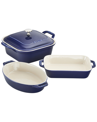 Rooted in French culinary heritage, Staub is beloved by professional and home chefs for its exquisite craftsmanship, exceptional performance, and timeless beauty.The new Staub Ceramic 4 Piece Set is the secret to savory casseroles and delicious desserts. The porcelain enamel glaze prevents absorption of moisture during baking, so foods won't dry out. Enjoy gooey mac n' cheese, buttery apple crumble, and moist brownies every time.The set is conveniently stocked with three different sizes and shapes. Thanks to their chic, classic design, each versatile piece easily transitions from the oven to the table. The 9"x 9" Square Covered Baker allows you to bake and serve in the same dish - plus, its lid locks in heat to keep your food warm.Equally beautiful and durable, the bakeware is extremely resistant to impact and thermal shock. Its gorgeous vitreous glass porcelain enamel finish puts a pop of color in your kitchen. Choose from a rainbow of French flag colors - white, dark blue, or cherry red. Made of stoneware with a vitreous glass porcelain enamel finish Stoneware will not absorb moisture, diffuses heat gently and retains heat exceptionally well Beautiful finish is highly scratch resistant Easy to grip handles offer maximum maneuverability Transitions from oven to table beautifully Oven, broiler, and microwave safe up to 572F without lid Freezer safe with lid Dishwasher safe Made in China