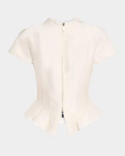 An architectural silhouette with a deconstructed peplum hem, STAUD's "Maelle" top features flattering French seams Collarless neckline Short sleeves Fitted Hip length Exposed front zipper closure Wool/viscose/silk Lining: Polyester Dry clean Imported