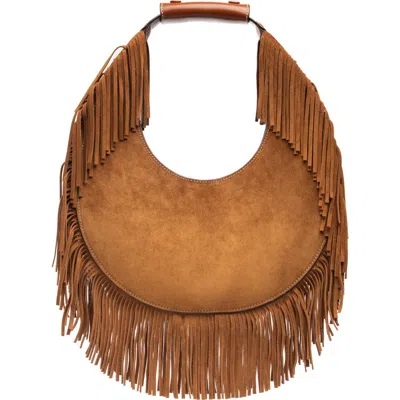 STAUD Round Shape Suede Fringe Tote Bag In Brown