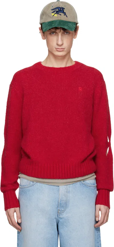 Knit alpaca- and nylon-blend sweater. · Rib-knit crewneck, hem, and cuffs · Logo embroidered at chest · Cutouts at sleeves Supplier color: Red