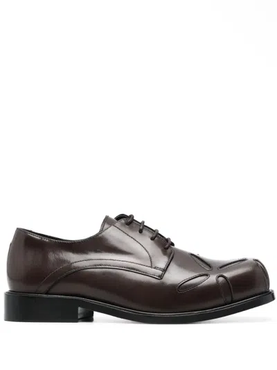 Slashed square-toe Derby shoes from STEFAN COOKE featuring cedar brown, leather, square toe, debossed detailing, front lace-up fastening, leather sole and panelled design.