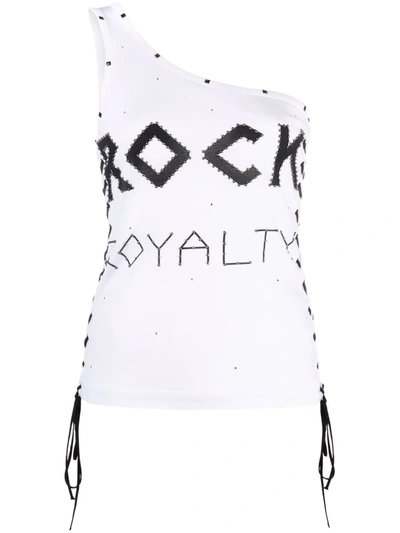 Stella McCartney Rock Royalty One Shoulder Top in Pure White - White. Size 36 (also in 38). 67% lyocell 33% cotton. Made in Portugal. Machine wash. One shoulder styling. Lace-up detail at sides. Rock Royalty at front with studded detail throughout. Jersey fabric. SMCC-WS123. 604196SPW24. About the designer: British designer Stella McCartney cut her teeth at Christian Lacroix, honed her skills on Savile Row, and refined her style as chief designer at Chloe before debuting her eponymous line in 2001. Known for tailored, feminine silhouettes, McCartney's easy aesthetic and cruelty-free clothing is a favorite with an international roster of trendsetters.