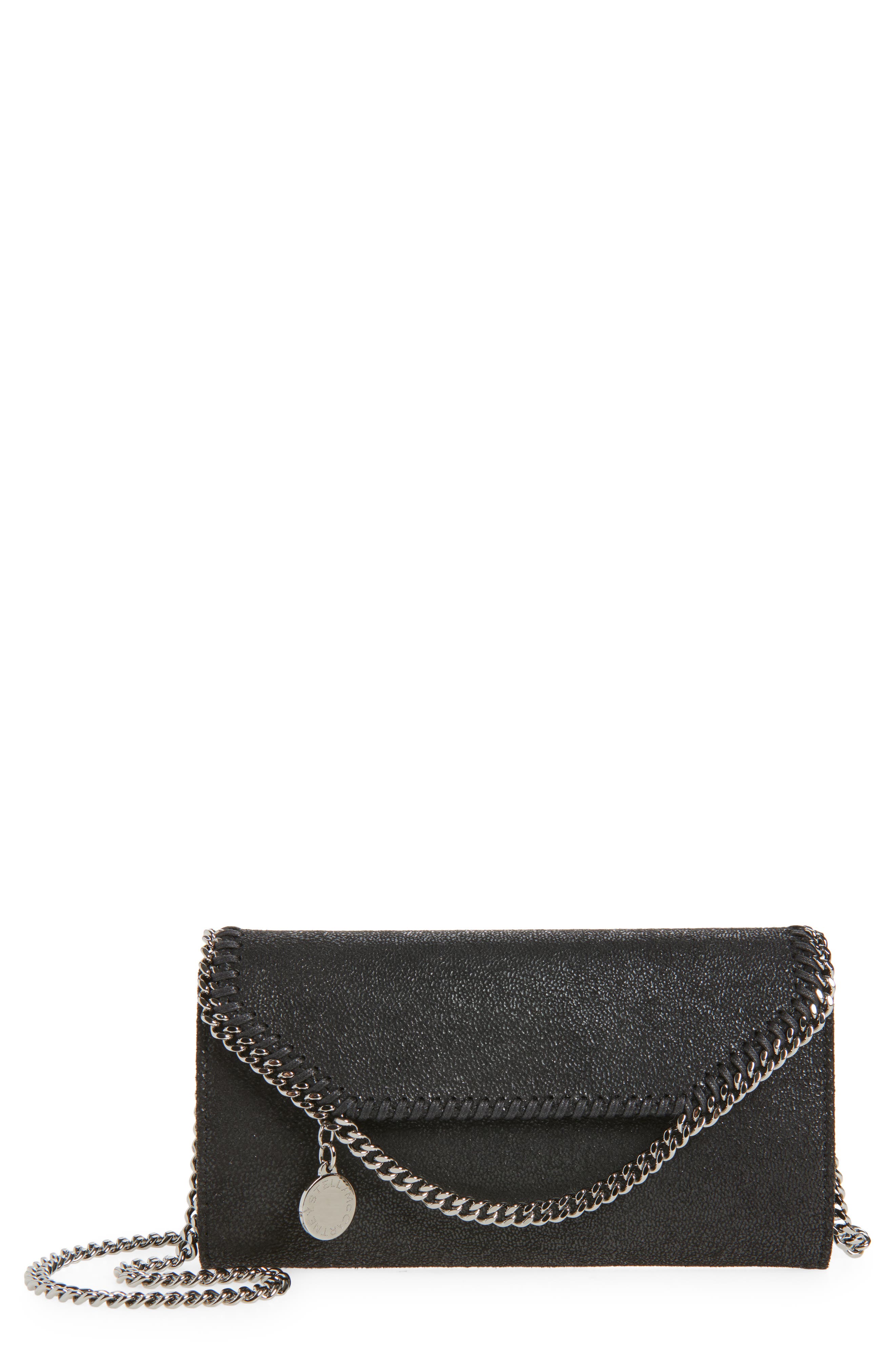 A gleaming diamond-cut chain outlines the whipstitched flap and serves as the strap of a well-organized wallet rendered in Stella McCartney's high-quality faux leather. Magnetic-snap flap closure Chain crossbody strap Interior zip pocket; wall pocket; six card slots Synthetic Made in Italy Designer Handbags