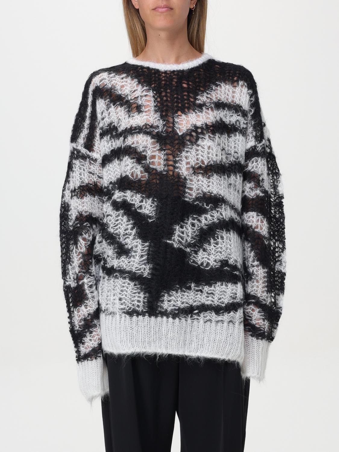 Black/white alpaca wool-blend open knit all-over tiger pattern crew neck drop shoulder long sleeves ribbed cuffs and hem. T 22% Polyamid 78% Wool Alpaca. Made in Italy. Multicolour. New with tags