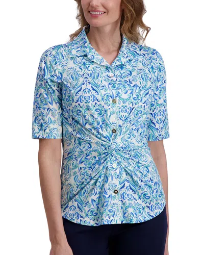 Elevate your everyday look with the Stella Parker Twist Button-Down Knit Top. This top is a perfect addition to your wardrobe, featuring a vibrant blue multicolor pattern that makes a statement. The twist front detail adds a touch of elegance, while the button front closure offers a versatile and chic style. Made with a blend of 92% polyester and 8% spandex, this top is comfortable and easy to care for - simply machine wash cold and tumble dry low. With a length of approximately 26 inches from shoulder to hem, this top is true to size and ideal for any occasion. Imported and designed with quality in mind, the Stella Parker Twist Button-Down Knit Top is a must-have for women who value style and sophistication.