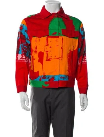 Stephen Sprouse Denim Jacket Red Printed Front Pocket Fit: Outerwear by Stephen Sprouse typically fit true to size. | Stephen Sprouse Printed Denim Jacket in Red, Men's M
