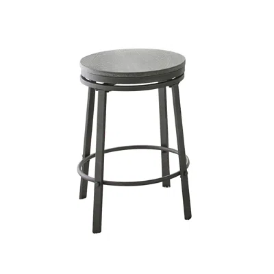 Mixed media counter set with compact design and stylish gray finish. Portland features swivel counter stools with stretchers for added strength and comfort and the round dining table fits well in any dining setting.