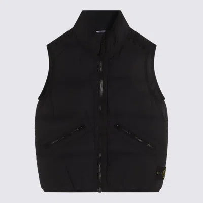 Dark blue down jacket from Stone Island featuring sleeveless, zip fastening, zip pockets and logo patch.