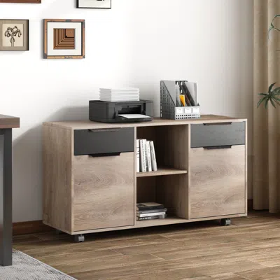 Mobile filing cabinet with 2 drawers, open shelves, and storage cabinets. Durable design, versatile storage, and easy mobility for home or office.
