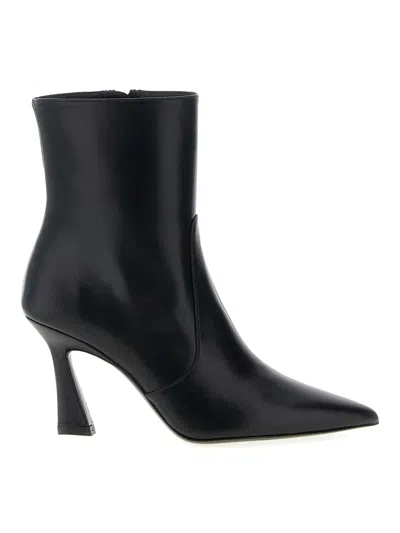 Stuart Weitzman "Vinnie" booties in smooth calf leather 3.25 in / 85 mm stiletto heel Pointed toe Side zip eases dress Leather lining and outsole Professional cleaning recommended Made in Spain
