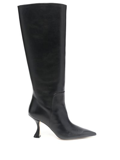 95mm pointed leather boots from STUART WEITZMAN featuring jet black, calf leather, pointed toe, short side zip fastening, high heel and pull-on style.