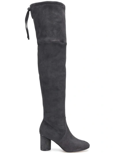 Grey suede Helena boots from Stuart Weitzman featuring a drawstring fastening, a round toe, a mid high block heel, a branded insole and a thigh high style.